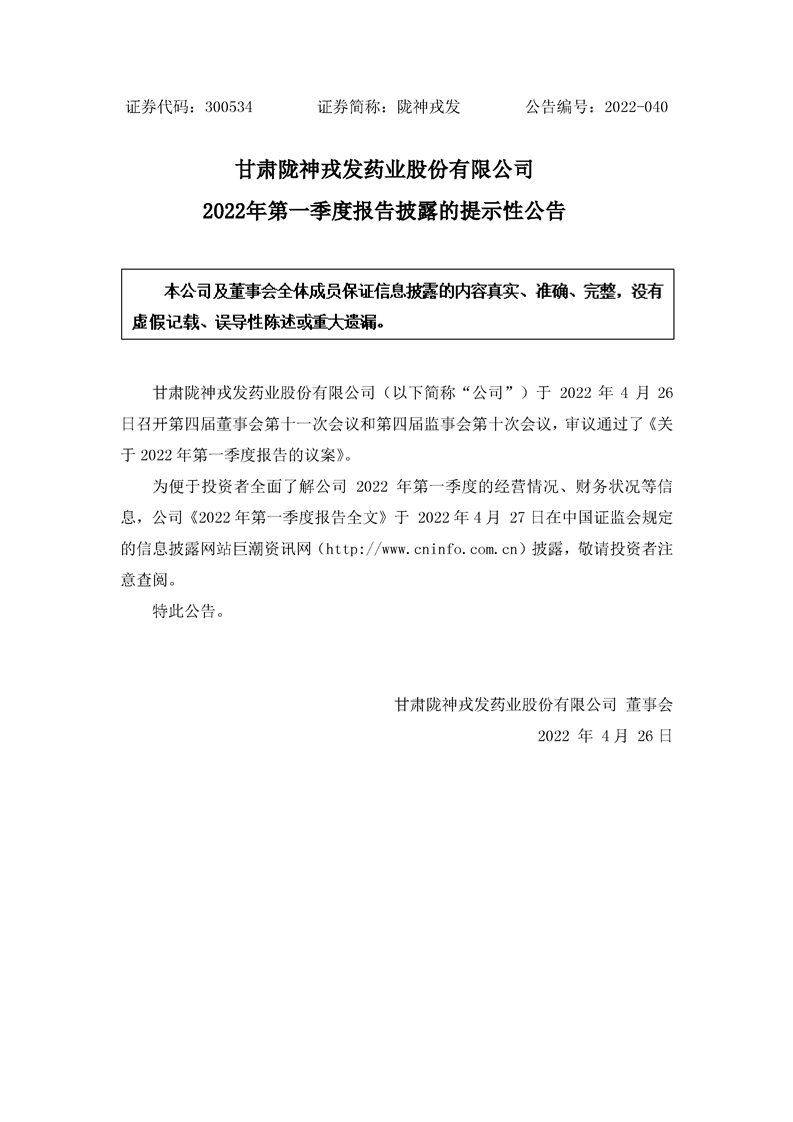 2022年第一季度報(bào)告披露的提示性公告